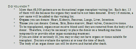 Attention! If you circled Yes for either of the above, be sure to write this into your health care Advance Directive. You may also fill out an organ donor card or register as an organ donor when you renew your driver's license. But be sure to tell your proxy and loved ones. Make sure they will support your wishes. Even with an organ donor card, hospitals will ask your proxy or family to sign a consent form.
